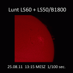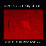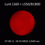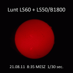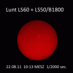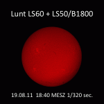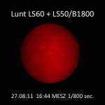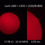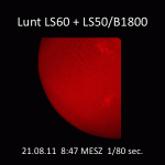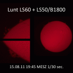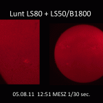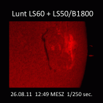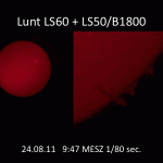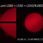 Sonnenoberfläche und Randprotuberanzen im H-alpha Licht, aufgenommen u.a. mit Lunt Solar Systems LS60 Teleskop mit vorgeschraubem LS50. Sowie mit LS100 am Lichtenknecker- bzw. Omegon-Refraktor mit Lille 20/20