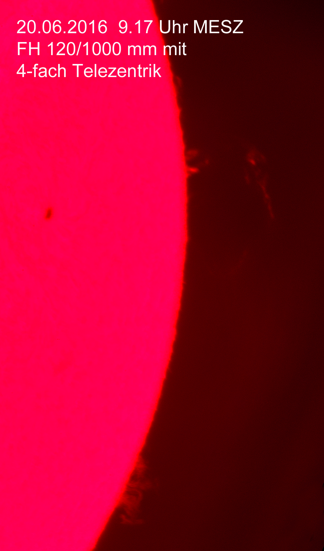 Am 29.06.16 habe ich eine Protuberanz mit drei verschiedenen Fernohrgrößen aufgenommen. Das Seeing bei der Aufnahme mit dem FH100/1500 mm muss besonders gut gewesen sein, denn das Foto zeigt sehr schön die Feinstrukturen der Chromospähre. Für die 120er Öffnung war das Seeing nicht gut genug.