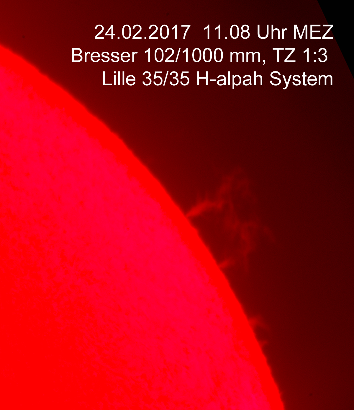 Endlich am 24. 02.2017 klärte sich der Himmel wieder bei mir auf und ich war gespannt, ob noch etwas von dieser Protuberanz zu sehen ist. Dazu die drei Fotos!