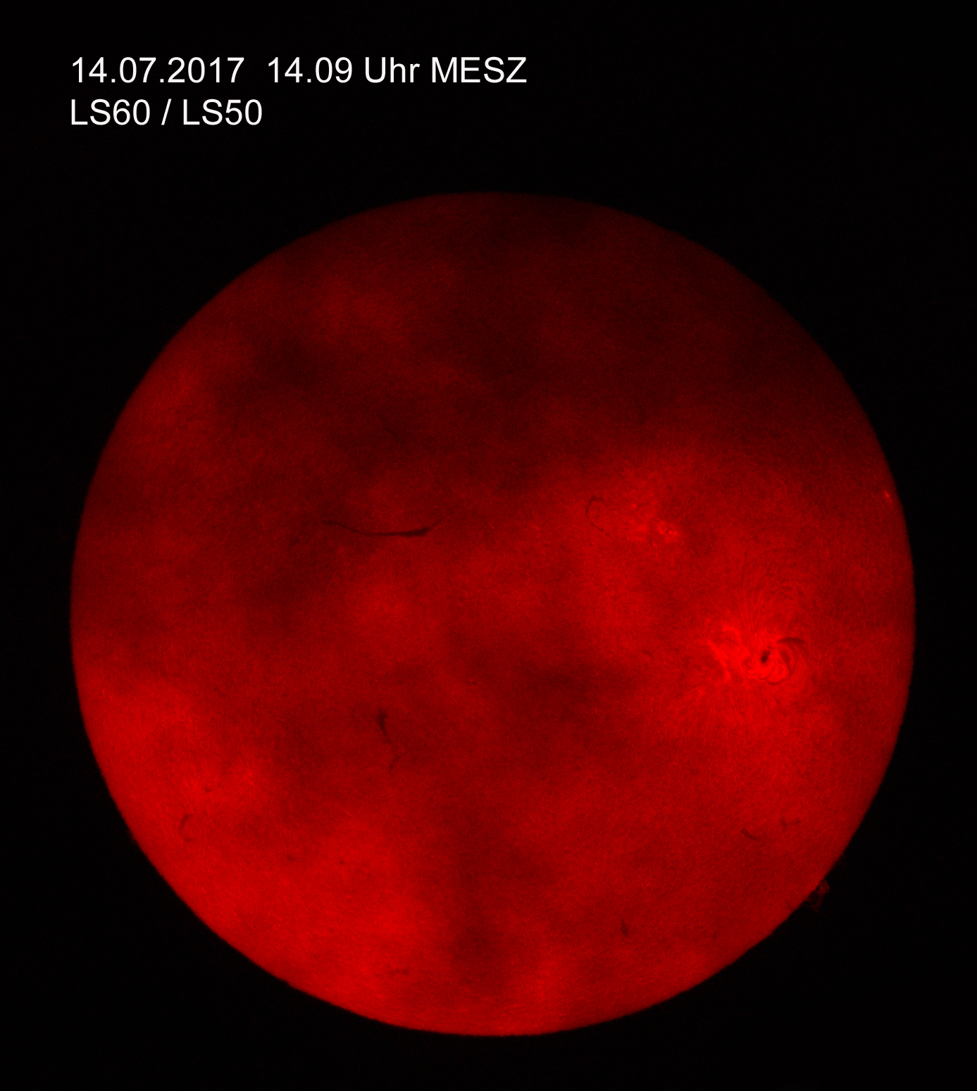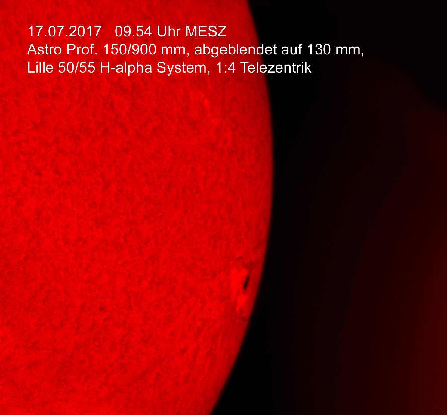 Insgesamt haben wir eine schwache Sonnenaktivität, trotzdem gab es zwei Highlights: Eine große E-Fleckengruppe (06.07.2017 bis 17.07.2017) und einige größere Randprotuberanzen (08.07.2017 und 09.07.2017). Aber auch einige sehr kontrastreiche kurze Filamente waren auf der Sonnenscheibe zu sehen.