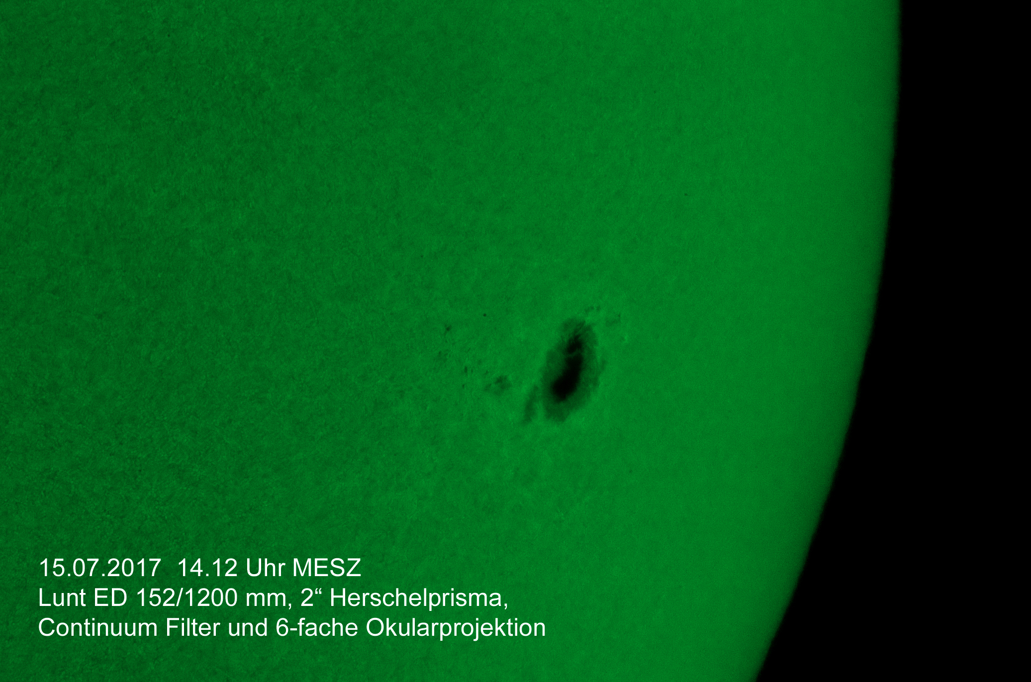 Nur an vier Tagen hatte ich blauen Himmel, aber auch an diesen Tagen kamen gegen Nachmittag wieder Wolken dazu. Und an 8 Tagen war es total bewölkt, teilweise sogar mit starken Regen! An anderen Tagen konnte ich kleine Wolkenlücken nutzen, um trotzdem noch gute Sonnenfotos zu erhalten. Ein Beispiel dazu das Foto vom 14.07.2017. In einer winzigen Wolkenlücke, konnte ich den Sonnenfleck und die zwei kurzen Filamente fotografieren. Diese Filamente erzeugtem am 08. und 09.07.2017 die schönen Ost-Randprotuberanzen. Am Nachmittag vom 08.07.2017 wurde es so diesig, das keine weiteren Sonnenfotos möglich waren… aber eine helle Nebensonne, projiziert auf die Schleierwolken, konnte ich fotografieren.