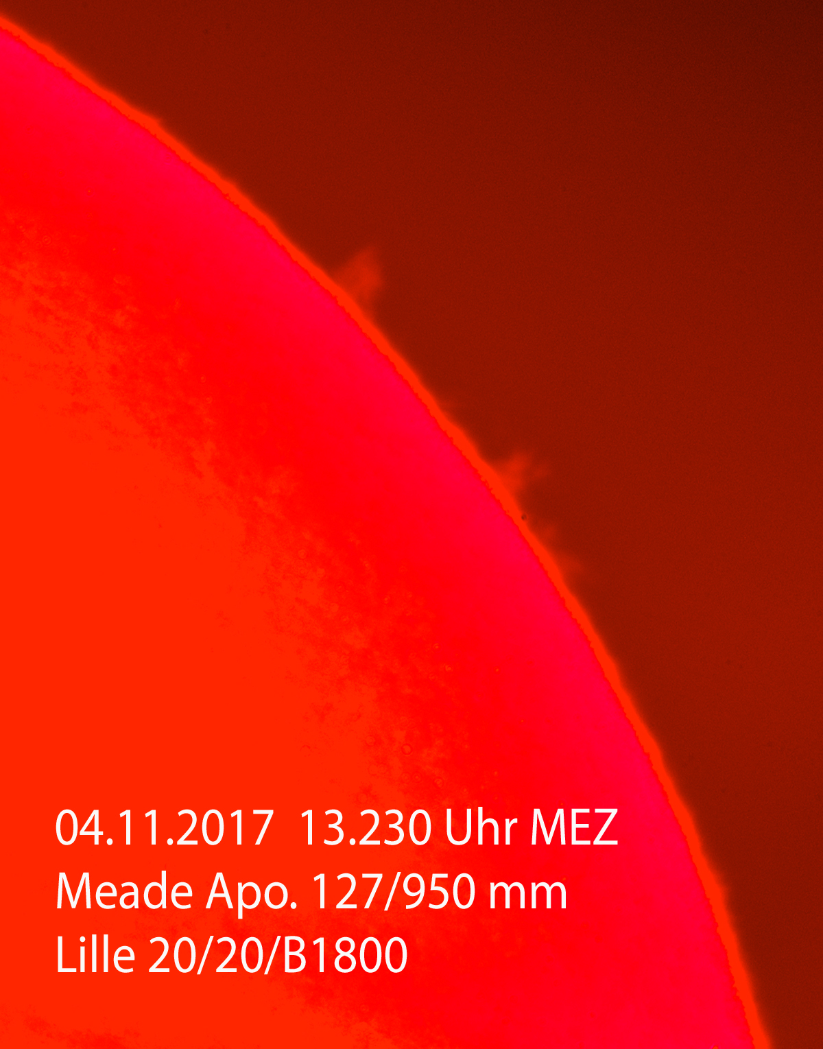 Protuberanz vom 04.11.17 Protuberanz vom 04.11.2017 Protuberanzen vom 04.11.2017 H-alpha Aufnahme vom 04.11.2017 H-alpha Aufnahme vom 04.11.17