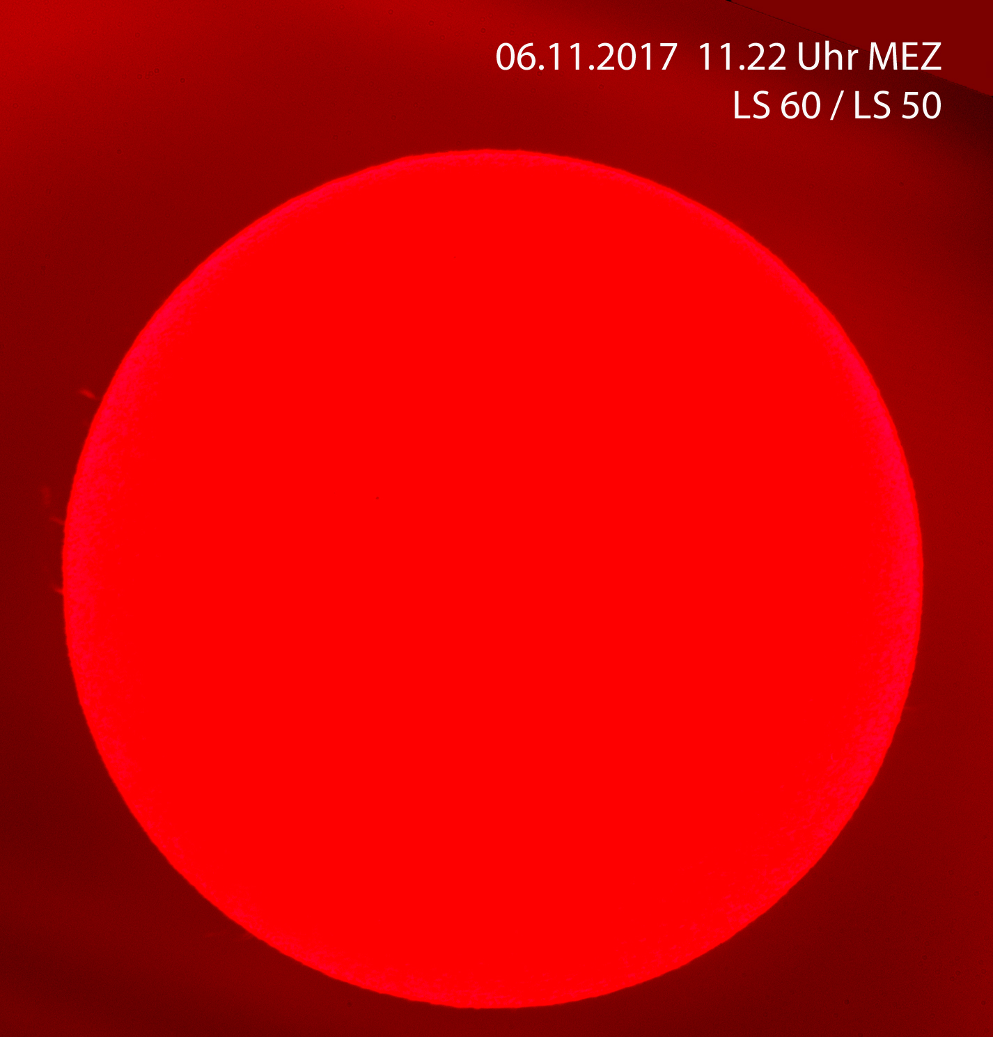Am 16.11.2017 gab es nur einen kleinen Einzelfleck, der sich aber schnell wieder auflöste. Sonst war die Sonne praktisch fleckenfrei! Aber einige schöne Randprotuberanzen waren im laufe des Monats zu sehen und auch einige Filamente auf der Sonnenoberfläche.