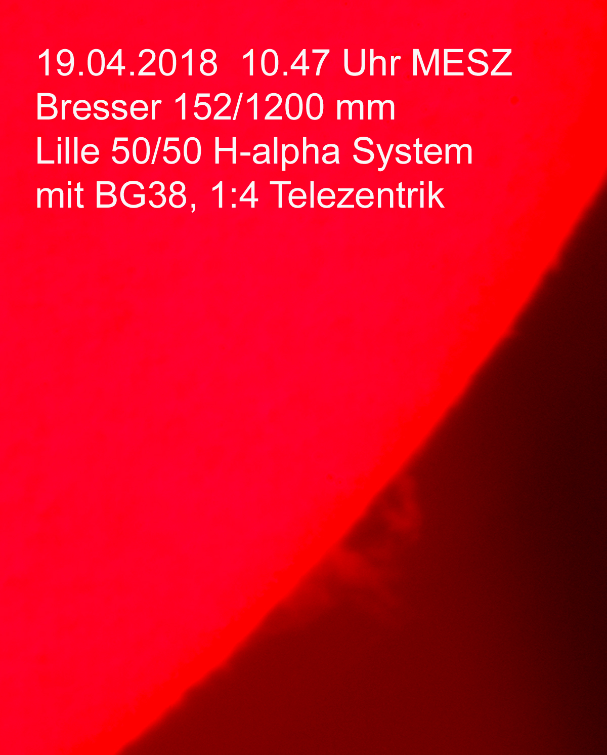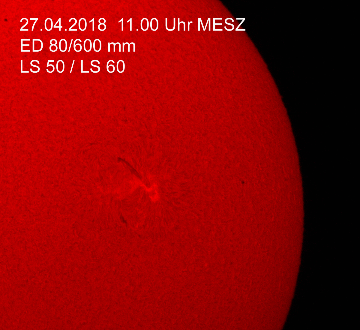 Ab dem 19.04.2018 überraschte mich eine kleine Fleckengruppe. Diese habe ich dann auch mit größeren Refraktoren fotografiert. Ebenfalls auch im H-alpha Licht. Schwierigkeit dabei ist, durch die viel längere Belichtungszeit (speziell bei schlechterem Seeing) eine gute Bildschärfe zu erzielen.