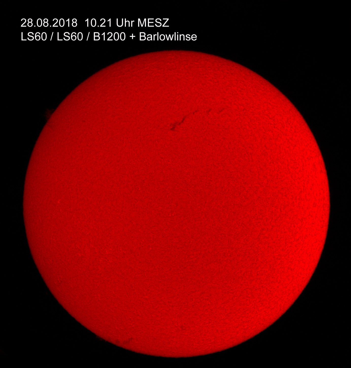 Bis zum 31.08.18 konnte ich an 19 Tagen die Sonne fotografieren. Größere Fleckengruppen waren auch in diesem Monat nicht vorhanden. Aber immerhin einige Aktivitätsgebiete und ab den 23.08.18 ein längeres Filament. Aber auch viele interessante Randprotuberanzen waren zu sehen. Am 21.08.18 habe ich wieder einmal ein Flugzeug voll im Sonnenlicht erwischt. Zum Monatsende konnte ich kaum Aufnahmen machen, weil doch der lang ersehnte Regen kam.